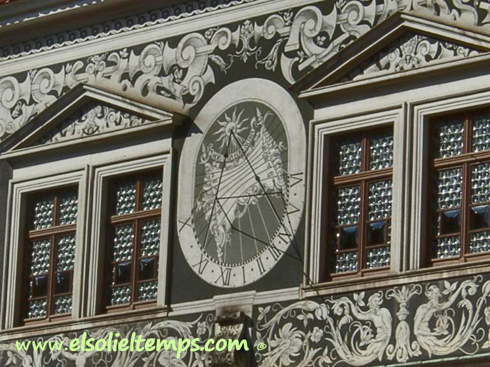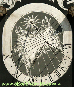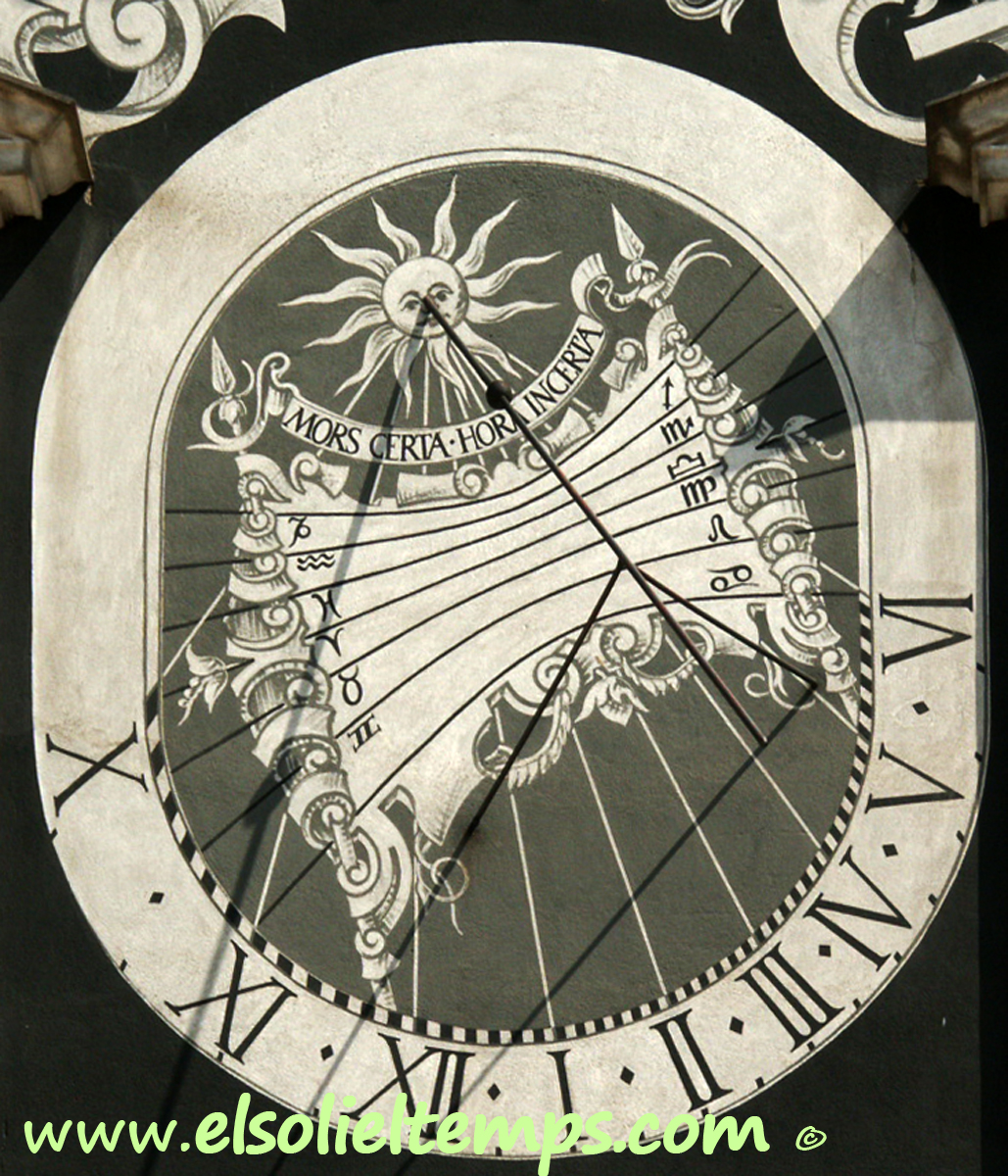 :: DESCRIPCIÓ: Vertical de tarda, línies horàries, punts a les mitges hores, zodiacals, números romans (de X a VI) en corona, analema al mig, gnòmon (60 cms.) doble recolzament, lema, elevació 117 mts. snm.
