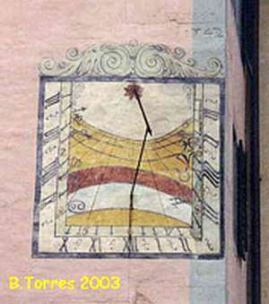:: DESCRIPCIÓ: Pintura a la façana lateral. Nums. Romans. Signes del zodíac.