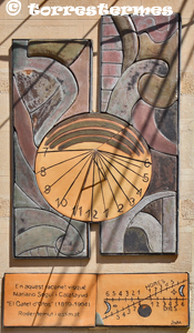 :: DESCRIPCIÓ: Vertical de tarda, formes abstractes, línies horàries, numeració aràbiga (de 7 a 6), gnòmon (25 cms.) recolzat, equació del temps i dedicatòria, elevació 322 mts. snm.