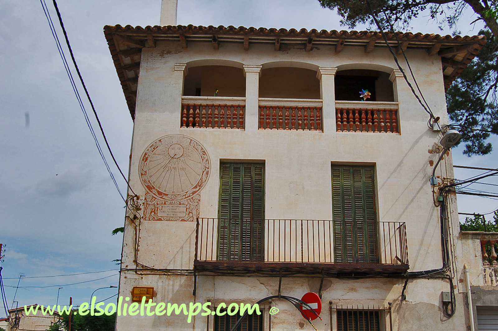 :: DESCRIPCIÓ: Vertical de matí, circular, línies horàries i mitges hores curtes, numeració aràbiga (de 5 a 4) en corona, gnòmon (25 cms.) vareta, lema, datat, elevació 300 mts. snm.