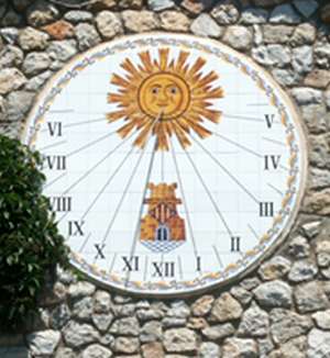 :: DESCRIPCIÓ: Circular. Línies horàries de 6 a 5, xifres romanes, gnòmon (20 cms) vareta. Hi ha representat un sol al pol i un castell, escut de la ciutat, a la part inferior