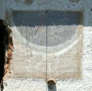 :: DESCRIPCIÓ: Pintura, a la façana d’una masia deshabitada. Hi resta el gnòmon i restes de la pintura original. Perill de desaparició