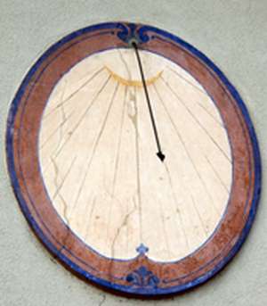 :: DESCRIPCIÓ: Rellotge circular situat a la façana lateral de la casa. Senzill sense numeració, hi ha les línies de les hores. El gnòmon esta una mica tort