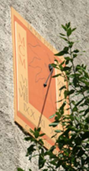 :: DESCRIPCIÓ: Quadrat, molt declinant, amb números romans (de VI a XIII). La data de construcció esta també en números romans (MCMLXXV)