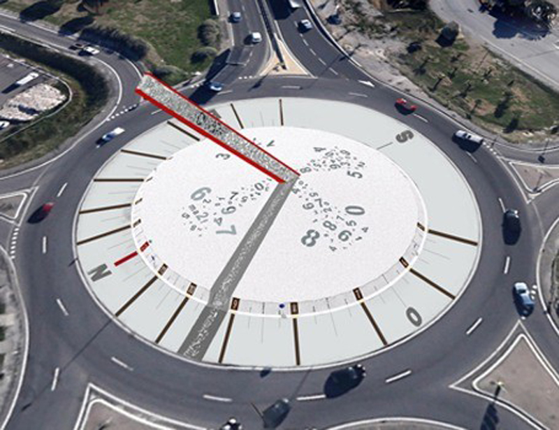 Un rellotge solar gegant de trenta metres de llargada i una agulla que s'aixeca vint-i-dos metres de terra. És la proposta que va fer l'artista parisenc Marc-André de Figuères a l'Aglomeració Perpinyà-Mediterrània i que avui s'inaugura al centre d'una rotonda a la sortida del peatge nord de Perpinyà. Més enllà de la monumentalitat, el rellotge també és notícia pel polèmic sobrecost de cent mil euros.
