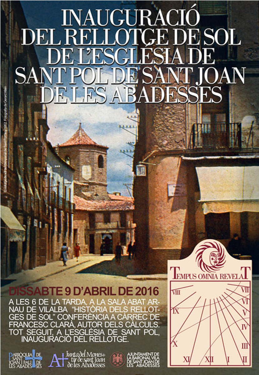 Quan l’hora ja gairebé només la mirem al mòbil, un rellotge de sol torna a presidir el tràfec quotidià dels santjoanins. Des de dissabte 9 d'abril, qui passi per sota de l’església de Sant Pol i aixequi la vista a la façana de migdia del campanar podrà saber l’hora gràcies a aquest antiquíssim sistema de mesura del temps, com havia estat durant segles. El rellotge de sol que s’hi ha instal•lat ocupa el mateix lloc que el que hi havia hagut des del segle XVII fins a mitjan segle XX, però és de nova construcció.
