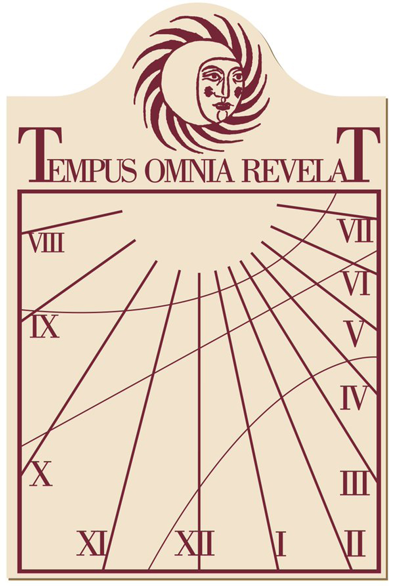 Sobre un gran bloc de marbre de la Sènia, de 300 quilos de pes, s’han marcat els números de les hores, les línies dels equinoccis i els solsticis, les tradicionals imatges del sol i la lluna i el lema que presideix el rellotge: “Tempus omnia revelat”. És a dir, que “El temps tot ho revela”, escollida per l’escriptor santjoaní Ramon Cotrina. Ve a dir que “si no vols que una cosa se sàpiga, no la facis, perquè tard o d’hora el temps ho descobrirà”, explica ell mateix en un text escrit per a l’ocasió.