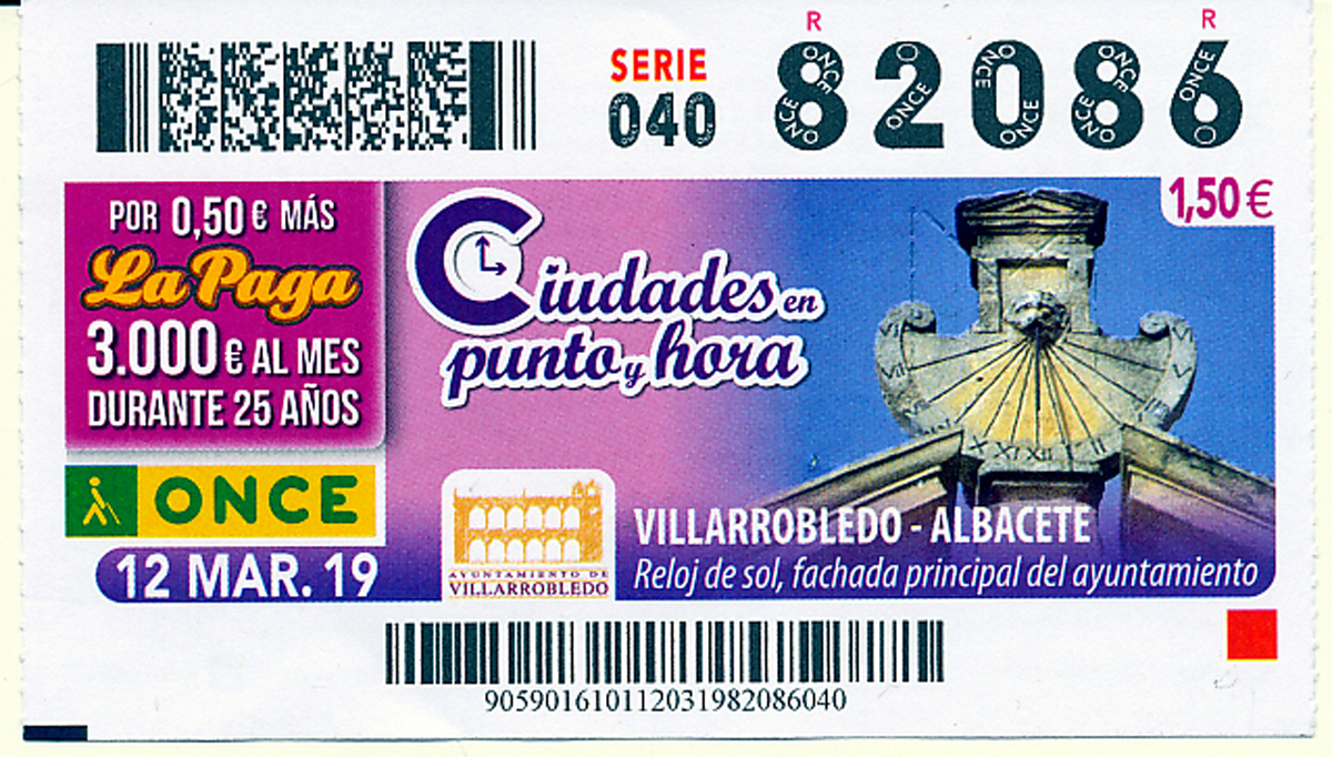 El Rellotge de Sol de la façana principal de l'Ajuntament de Villarrobledo (Albacete), protagonitza el cupó de l'ONCE del 12 de març, dins de la nova sèrie de cupons 'Ciutats en punt i hora'. Amb aquesta nova sèrie, l'ONCE vol recordar la funció que realitzen aquests rellotges, unes màquines de precisió, algunes amb més d'un segle de funcionament.