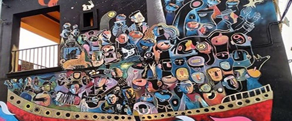 El mural representa el viatge en vaixell rumb l’Argentina. Conté una sèrie de referències icòniques valencianes i argentines. Músics, llauradors, hòmens i dones, xiquetes i xiquets, somiadors, tafurs, il•luminats, aventurers... encaren amb una barreja d’esperança i resignació un futur incert, però prometedor, lluny de la seua llar. Entre les referències, una partida de truc: el joc de cartes nacional dels valencians esdevingut el més popular de l’Argentina. Al cel hi podem veure algunes constel•lacions tal com es veuen des de l’hemisferi sud. Sobre la balconada, una raboseta (animal representatiu de la identitat dels otosins) acomiada el vaixell amb un gest de tristesa. Per acabar-ho de lligar, hem fet que el rellotge de sol marque l’hora de Buenos Aires.