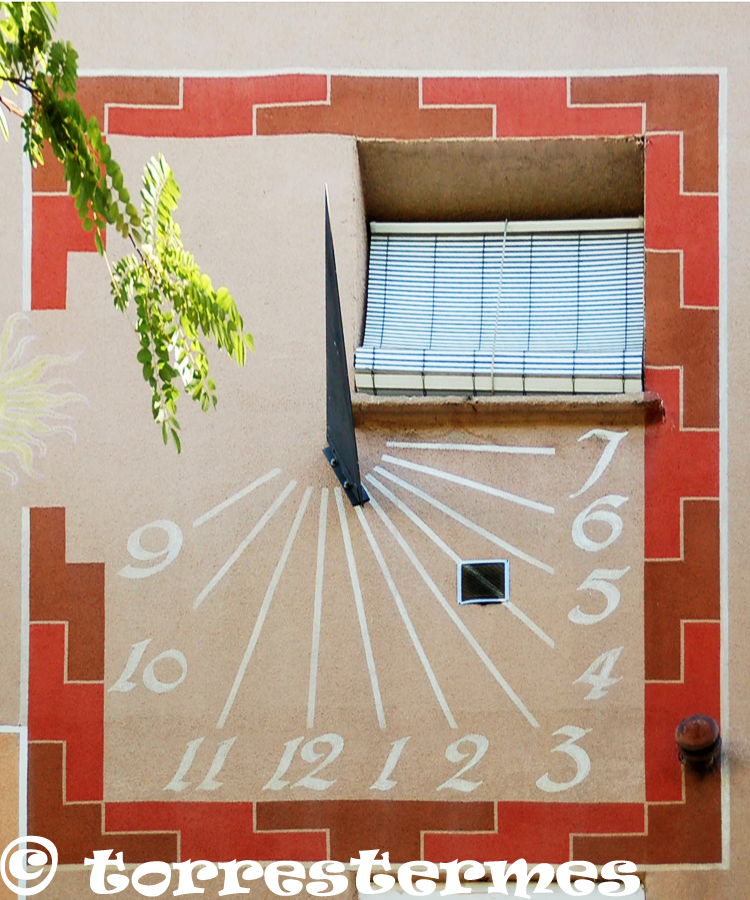 The walls where the sundials are located decline to the west between 17 and 23 degrees west. The dominant colors in the sundials of the facades are intoned with the exterior paint of the same, yellow and fuchsia, while in the interior of the passageways dominates the blue and white. All exterior sundials have a flaming Sun drawn. The gnómones are triangles of painted aluminum sheet, with the side that holds them to the wall in the direction of the subestilar line. p>