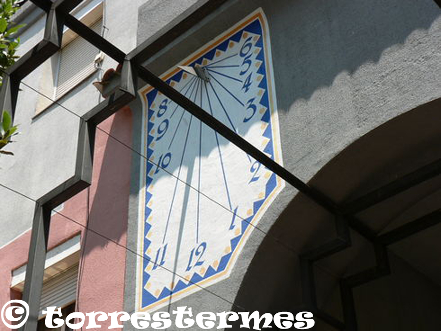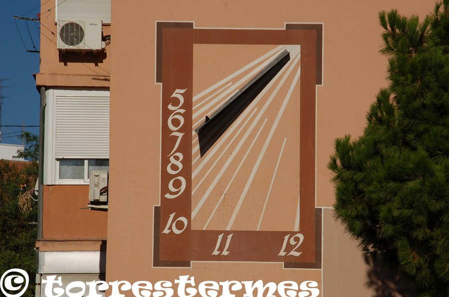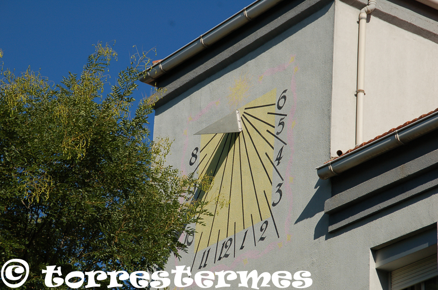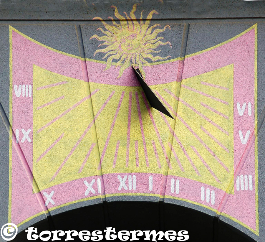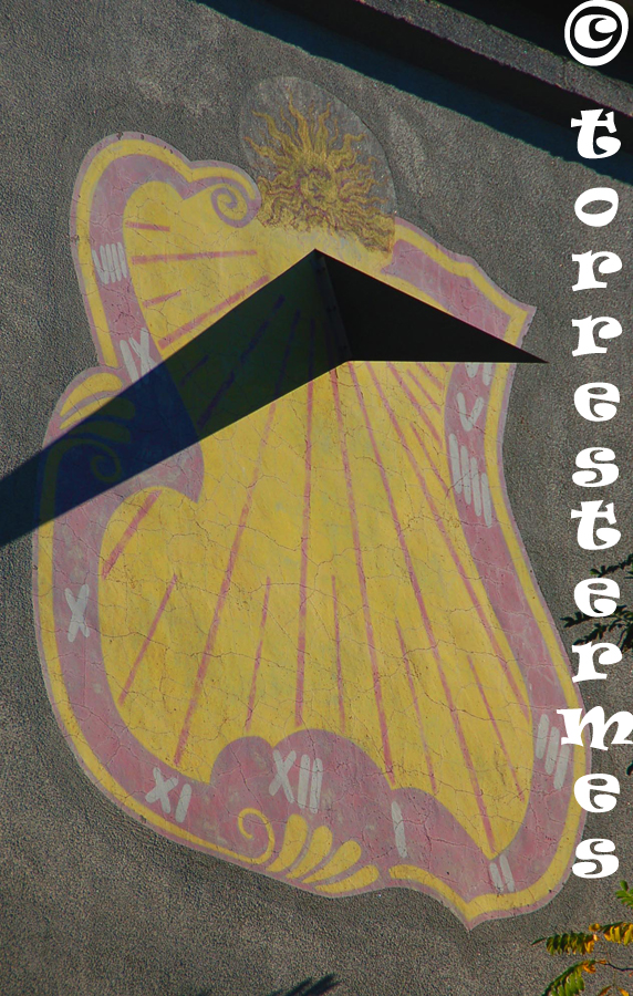 From this street you can see these large sundials on the lateral facades of 4 buildings declining 67 degrees east. The sundials are equal two to two, and with dimensions of 8 x 4 m and 4 x 2.5 m respectively. The dominant colors are ocher, brown and gray (gnomones). All have a sun drawn on top and his gnomon is an elongated straight trapezoid 2 m long, cut out of painted aluminum sheet. p>