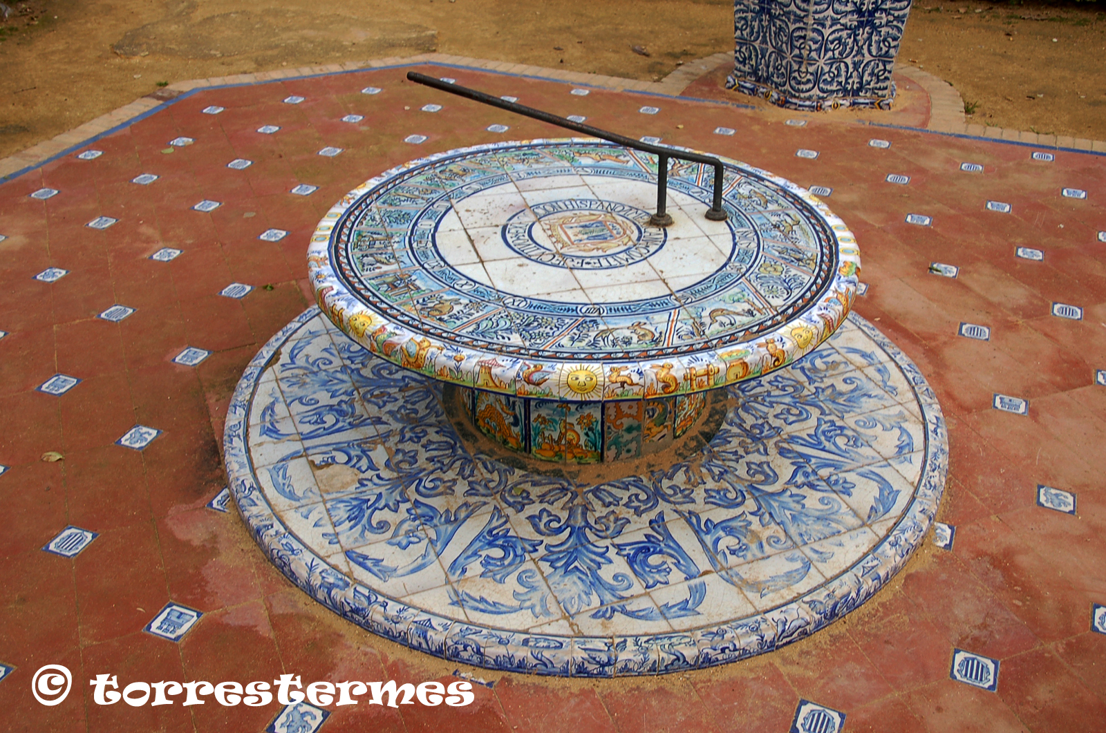 Another solar sundial that can not be overlooked is the horizontal sundial in the Parque de Mª Luisa, Plaza de América. The sundial is circular and is made with typical Sevillian tiles. It dates from the time of the Ibero-American Exposition. There is a sun in the center of the sundial, and the gnomon is metal.